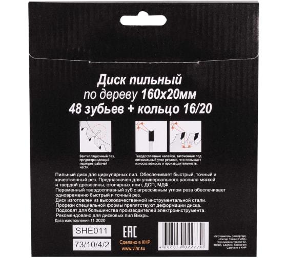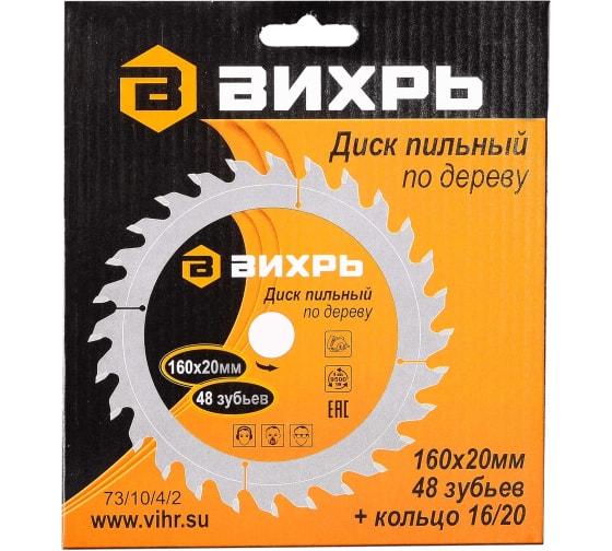 Диск пильный по дереву 160х20мм 48 зубьев+кольцо 16/20 Вихрь 73/10/4/2
