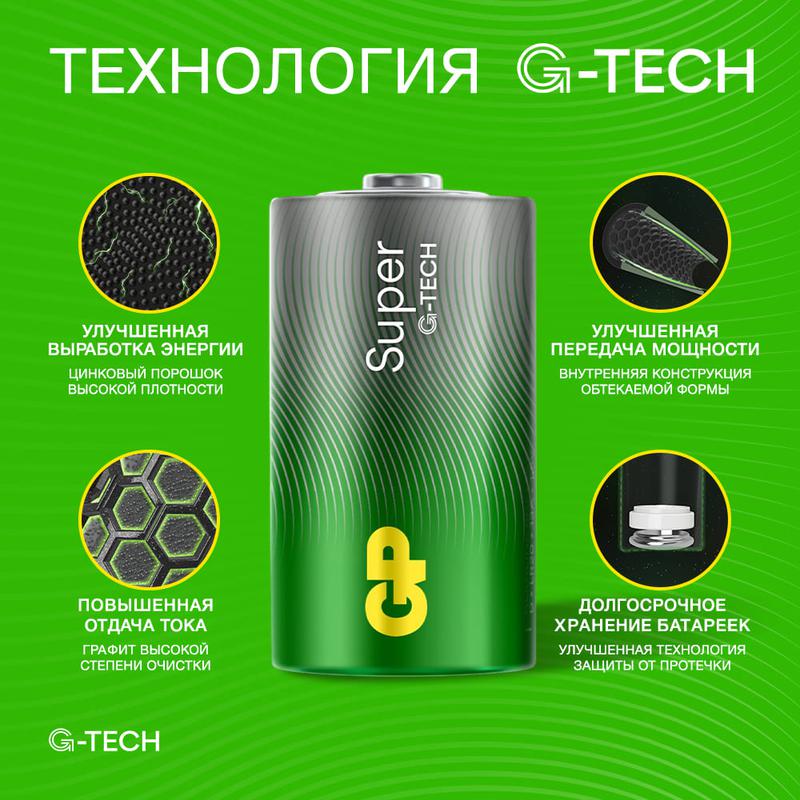 1225 | Элемент питания алкалиновый D/LR20 1.5В Super Alkaline G-Tech 13AA21-2CRSBC2 20/160 (блист.2шт) GP