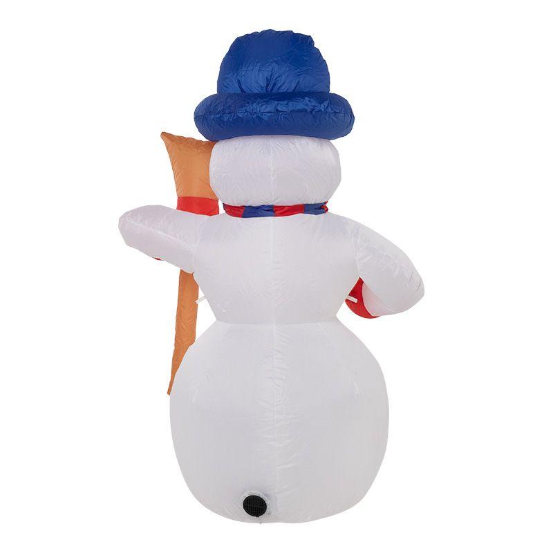 Надувная 3D-фигура «Снеговик с метлой» высотой 180 см выполнена в виде забавного доброго персонажа, который будет отлично смотреться на уличной площадке возле дома, специально оформленной террасе или в холле. Снеговик, выполненный из прочного капрона, надувается при помощи компрессора. Устройство поддерживает постоянный объем воздуха, создавая легкие колебания конструкции. 4 диода ярко освещают фигуру, которую прекрасно видно в темное время суток. Изделие защищено от влаги и пыли по стандарту IP65. В комплекте идет компрессор, крепеж и понижающий адаптер для подключения к стандартной питающей сети 230 Вольт.