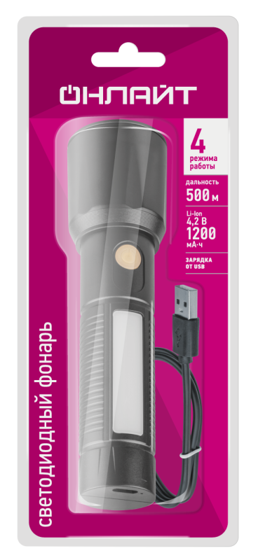 "Светодиодный ручной фонарь «Онлайт» серии OPT-CP – отличное решение для использования на даче, в путешествиях и туристических походах. Мощная линза и боковая подсветка делают фонарь отличным помощником в любой ситуации. - 4 режима работы: луч 100% и 50%, мерцание, кемпинг