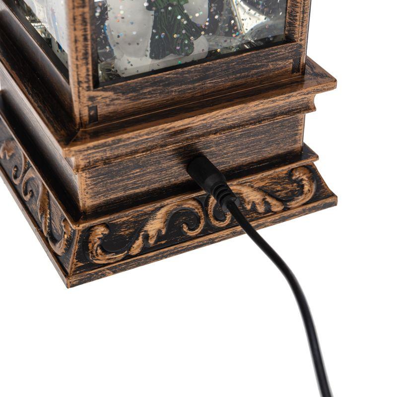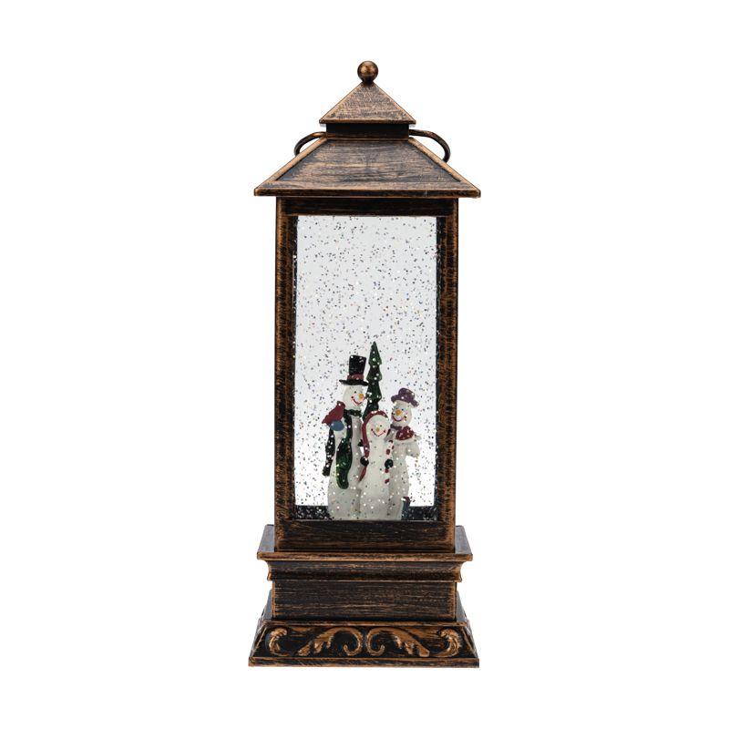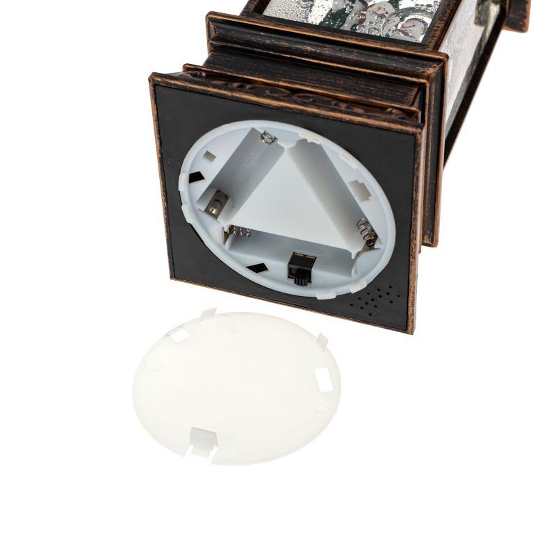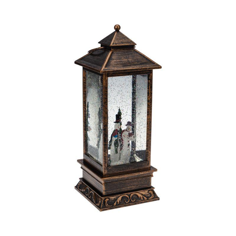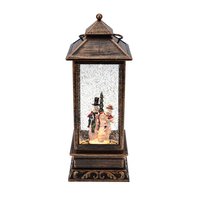 Декоративный фонарь с эффектом снегопада и подсветкой «Новый год» перенесет вас в атмосферу зимней сказки, где среди праздничных огней и домашнего уюта стоит наряженная елка, а дети радуются подаркам. Оригинальное интерьерное украшение выполнено в бронзовом цвете, внутри колбы находятся фигурки ели и Снеговиков. Вихрь серебристых блесток, подсвечиваемых диодами теплого оттенка, имитирует зимнюю вьюгу. Фонарь питается от 3 батареек типа AA и может работать через USB-кабель с сетевым адаптером.