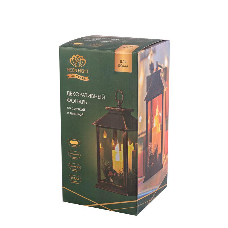 Фонарь декоративный со свечкой и шишкой бронзов. корпус 14х14х27см тепл. бел. Neon-Night 513-048