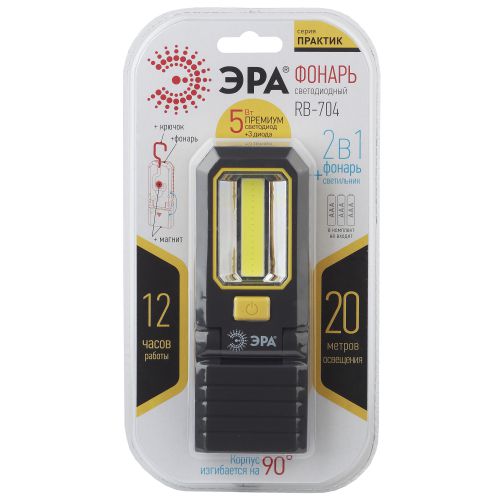 ЭРА Практик RB-704 - многофункциональный светодиодный фонарь с режимом светильника и двумя типами крепления. Корпус сгибается в двух направлениях (по 90 градусов каждое). На торце - мощный магнит. Дополнительный магнит расположен на задней стороне фонаря. Имеется удобный прочный крючок. Закрепив ЭРА RB-704 на нужной поверхности, можно быстро настроить необходимый для работы угол освещения. Переключение режима превращает фонарь в светильник c ближним заливающим светом. Фонарь ЭРА Практик RB-704 незаменим как при профессиональных работах (строительство, ремонт, монтаж, обслуживание), так и в частном использовании (работы в доме, на приусадебном участке, путешествия). Покрытие корпуса - софт-тач (мягкое, приятное на ощупь, без скольжения). Основной режим освещения - яркая LED-плата СОВ (5 Вт). Сопутствующий - 3 диода на торце с направленным лучом длиной до 20 метров. Сверхмощные светодиоды COB ("chip on board" - "кристалл на плате") ранее применяли исключительно в промышленном освещении, сейчас технологию удалось адаптировать под универсальные цели. Получился яркий и при этом мягкий ровный свет. Одного комплекта батареек (3 мизинчиковые) хватит на 12 часов непрерывной работы.