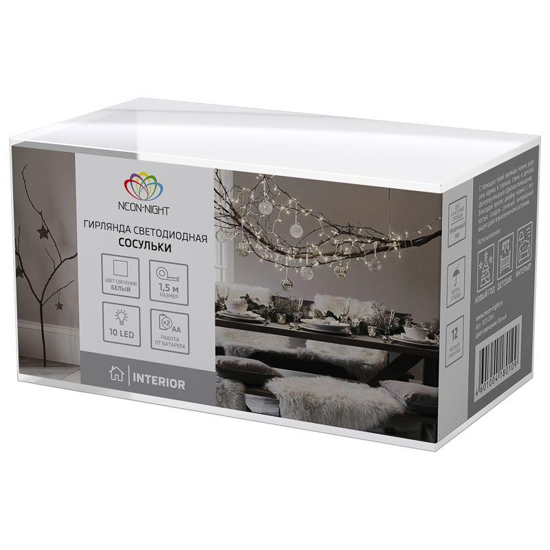 Гирлянда светодиодная "Сосульки" 1.5м 10LED бел. 0.1Вт IP20 провод прозр. ПВХ элементы питания 2хAA (не в компл.) Neon-Night 303-094