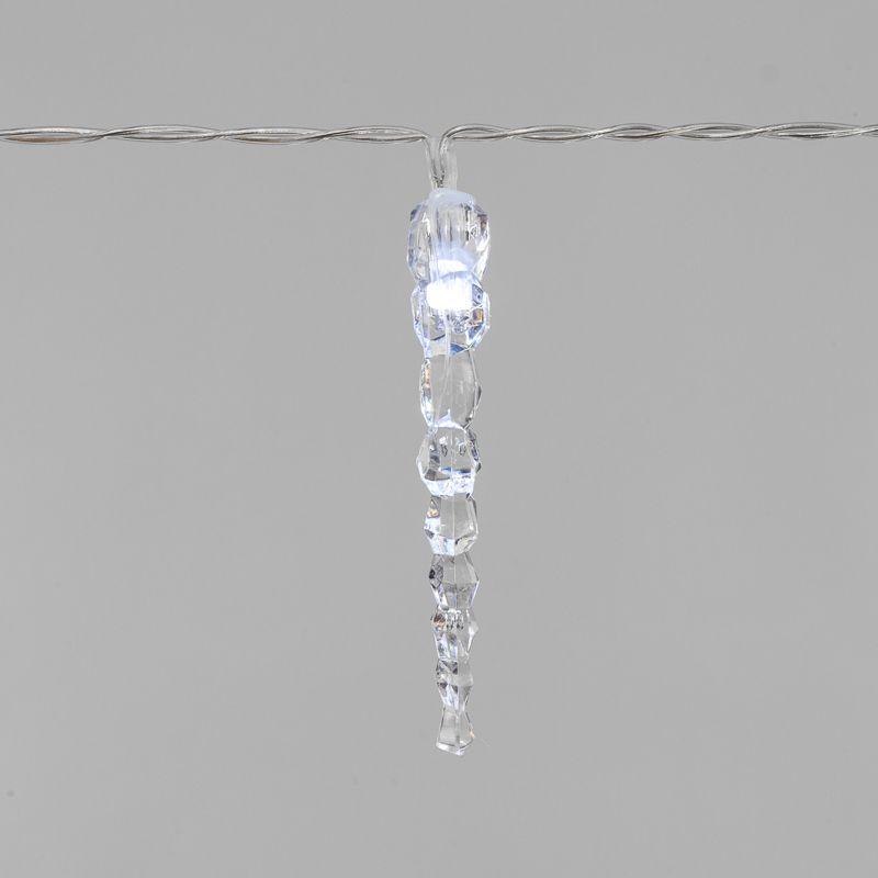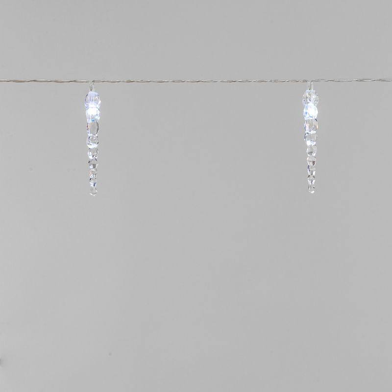 Светодиодная гирлянда «Сосульки» длиной 1,5 метра украшена пластиковыми насадками в виде ледяных сосулек, которые ярко подсвечиваются диодами. Украшение способствует созданию магической атмосферы праздника и помогает эффектно оформить интерьер. 10 сосулек расположены на расстоянии 16 сантиметров друг от друга, в качестве основы используется электрический кабель в надежной изоляции из прозрачного ПВХ. Диоды белого свечения питаются от двух батареек АА, которые помещаются в небольшой блок на конце кабеля. Безопасное изделие на батарейках — прекрасный вариант для оформления детской комнаты.