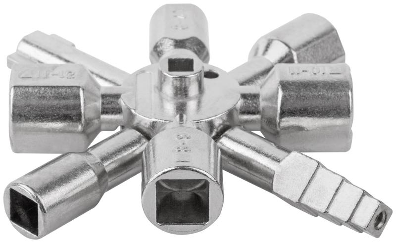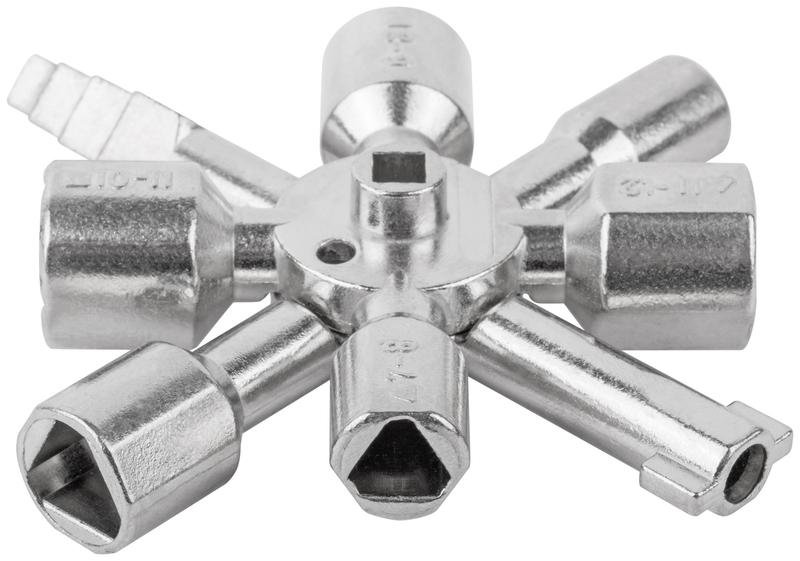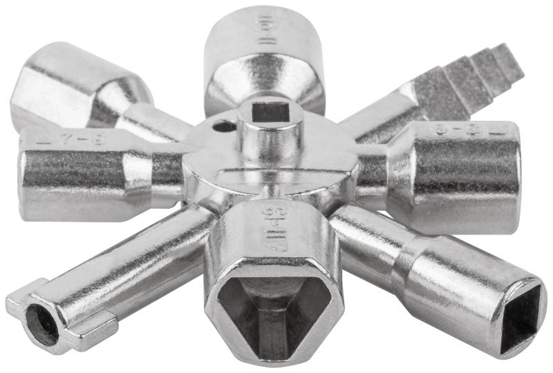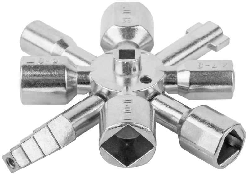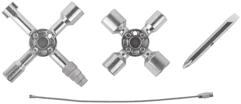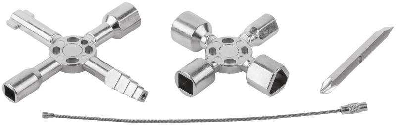 Ключ универсальный для электрошкафов FIT IT 10-в-1 предназначен для открытия электрических и сантехнических шкафов в коммуникациях зданий и транспорта, а также в системах рециркуляции воздуха. Имеет 10 наиболее распространенных форм ключей. Встроенный паз с магнитом позволяет фиксировать биту. Ключ изготовлен из цинкового сплава и обладает длительным сроком службы. Никелевое покрытие предотвращает коррозию. Компактный размер ключа дает возможность носить его в кармане.