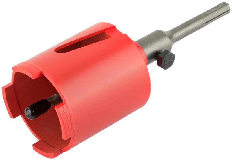Коронка кольцевая алмазная КУРС с центрирующим сверлом и хвостовиком SDS-plus предназначена для безударного сверления отверстий под монтажные коробки в бетоне (в том числе армированном) и кирпиче. При работе требуется водяное охлаждение. Центрирующее сверло из легированной стали с наконечником из композитного карбид-вольфрамового сплава ВК6 позволяет точно позиционировать коронку и предотвращает ее смещение во время работы. Резцы коронки покрыты порошком из технических алмазов.