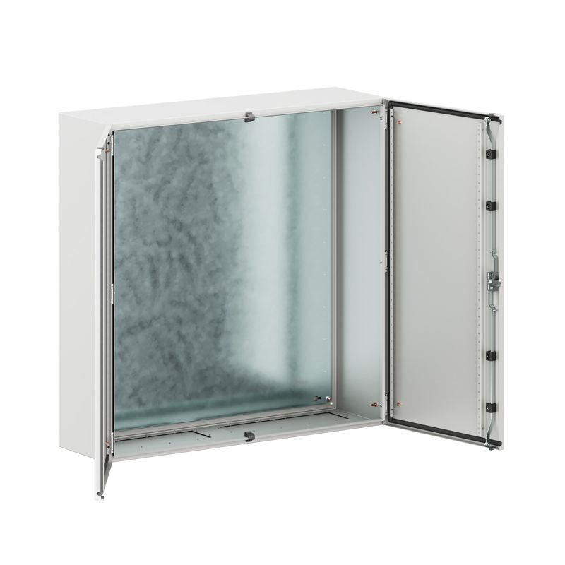 Навесные корпуса серии ST предназначены для систем автоматизации и распределения электроэнергии. Корпус, фланец изготавливаются из стали толщиной 1,2 мм, дверь из стали толщиной 1,5 мм с атмосферостойким порошковым покрытием, цвет RAL7035. Монтажная плата - из оцинкованной стали толщиной 1,8 мм. Степень защиты IP55, ударопрочность IK10, сейсмостойкость 9 баллов по шкале MSK-64, климатическое исполнение УХЛ1, ОМ2, ОМ3, группа горючести Г1. Комплект поставки: корпус, дверь двустворчатая, монтажная плата с двунаправленной разметкой, дверные рейки, ручка, сплошной фланец для ввода кабеля 2 шт., комплект заземления без проводов, монтажные аксессуары. Габариты 1000x1000x300 (ВхШхГ) мм.
