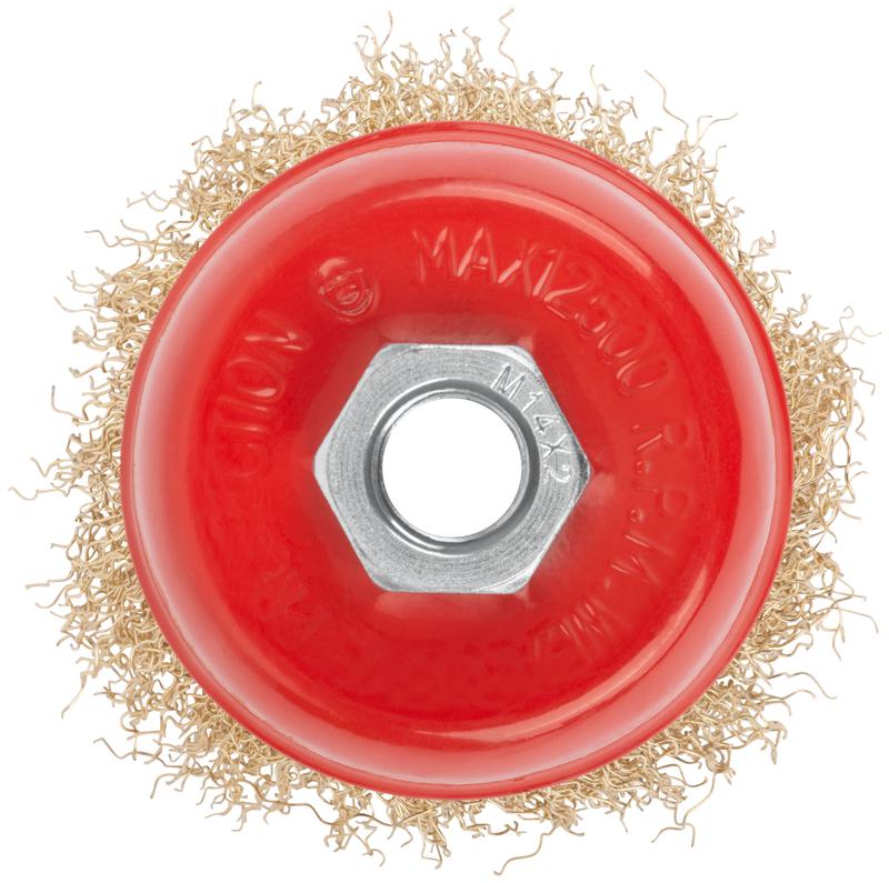 39037 | Корщетка чашечная гайка М14 стальная латунированная волнистая проволока 75мм КУРС