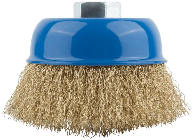 Корщетка-насадка для УШМ MOS типа ‘’чашка’’ предназначена для обработки дерева и металла, снятия краски. Форма «чашка» обеспечивает хорошую площадь прилегания к поверхности. Волнистая проволока обеспечивает деликатную зачистку поверхностей. Латунное покрытие проволоки предотвращает коррозию. Гайка с резьбой М14 обеспечивает прочную фиксацию на УШМ.