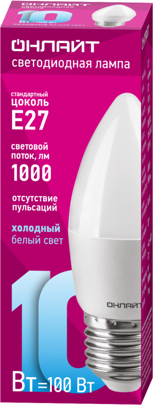 61961 | Лампа светодиодная 61 961 OLL-C37-10-230-6.5K-E27-FR 10Вт свеча 6500К холод. бел. E27 1000лм 176-264В ОНЛАЙТ