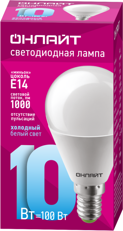 61967 | Лампа светодиодная 61 967 OLL-G45-10-230-6.5K-E14 10Вт шар 6500К холод. бел. E14 1000лм 176-264В ОНЛАЙТ