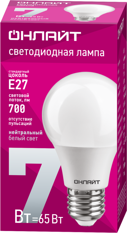 71648 | Лампа светодиодная 71 648 OLL-A60-7-230-4K-E27 7Вт грушевидная 4000К нейтр. бел. E27 700лм 176-264В ОНЛАЙТ