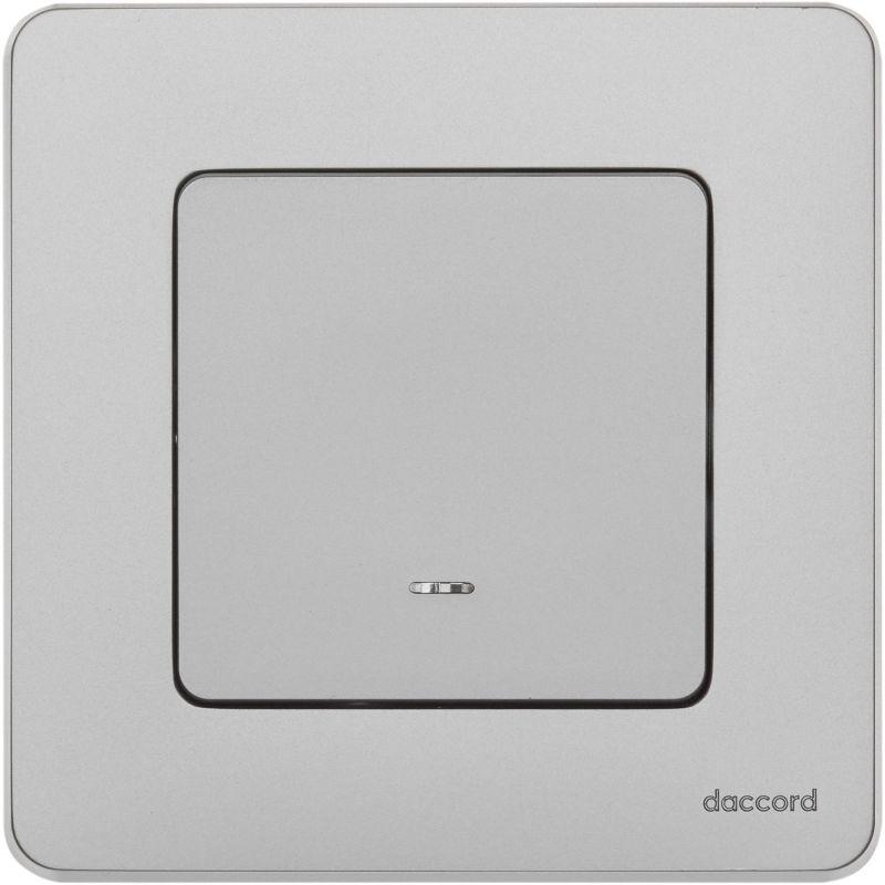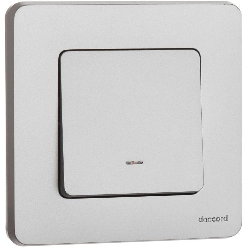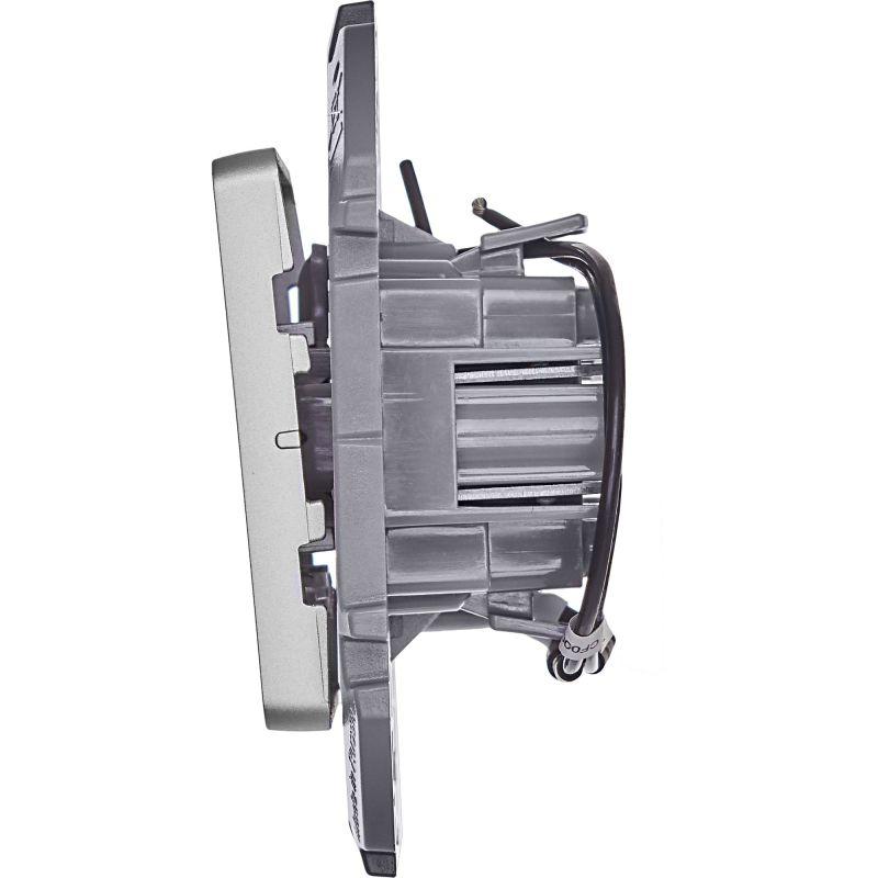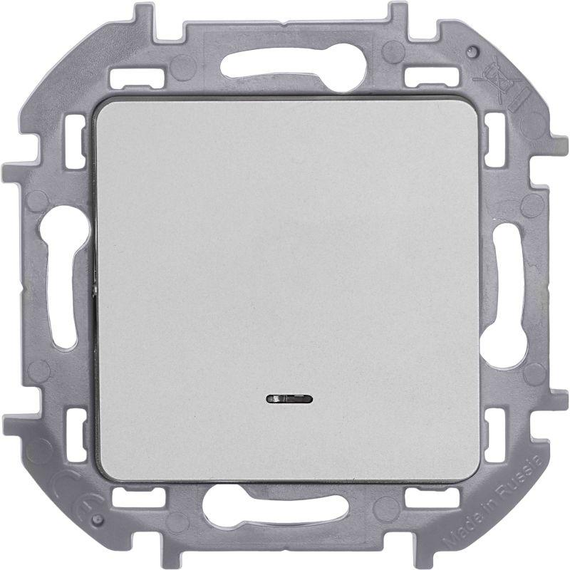 Переключатель одноклавишный с подсветкой/индикацией скрытого монтажа Inspiria, цвет "Алюминий", номинальный ток 10АХ, напряжение ~250В, безвинтовые зажимы. Устанавливается в жилых и общественных помещениях для управления приборами освещения, вентиляции и т.д. Предназначен для управления одной нагрузкой с одного, двух или более мест (совместно с перекрёстными переключателями).