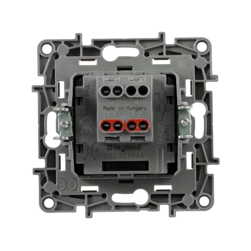 Переключатель промежуточный (перекрёстный) одноклавишный ETIKA для скрытого монтажа. Предназначен для использования в схемах управления нагрузками с трёх и более мест. Применяется совместно с переключателями на два направления (проходными). Устанавливается в жилых и общественных помещениях для управления приборами освещения, вентиляции и т.д.