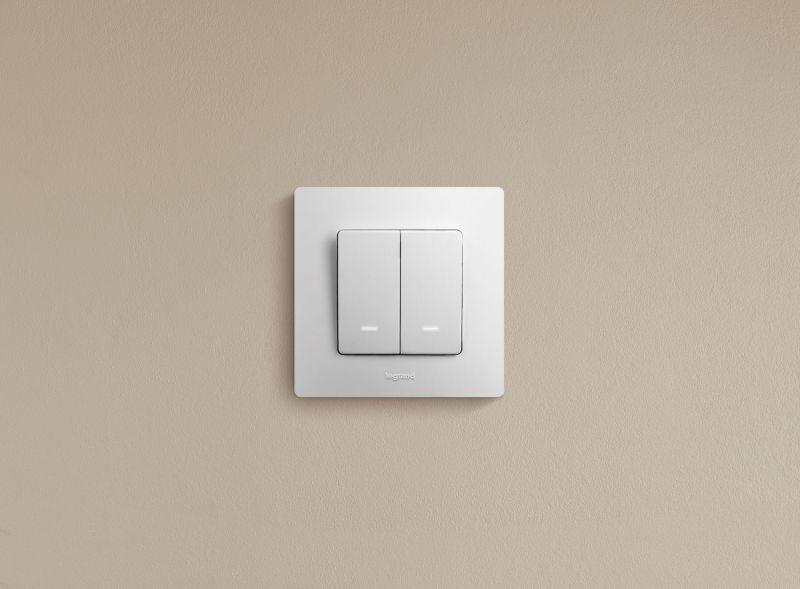 Выключатель с подсветкой двухклавишный ETIKA для скрытого монтажа, номинальный ток 10 А. Предназначен для управления двумя электрическими цепями.