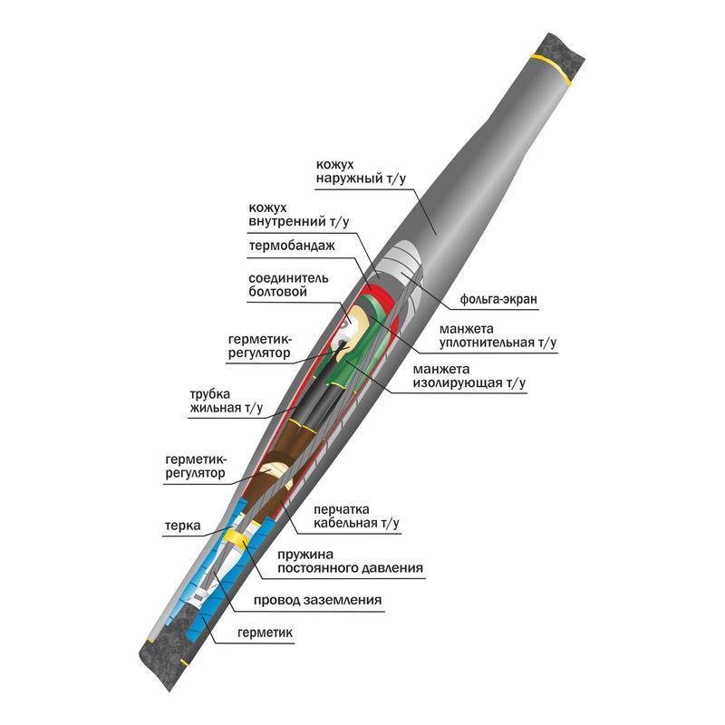 Монтируется на двух концах соединяемых кабелей путем термоусаживания деталей из модифицированного полимера с помощью газовой горелки или высокотемпературного фена.
