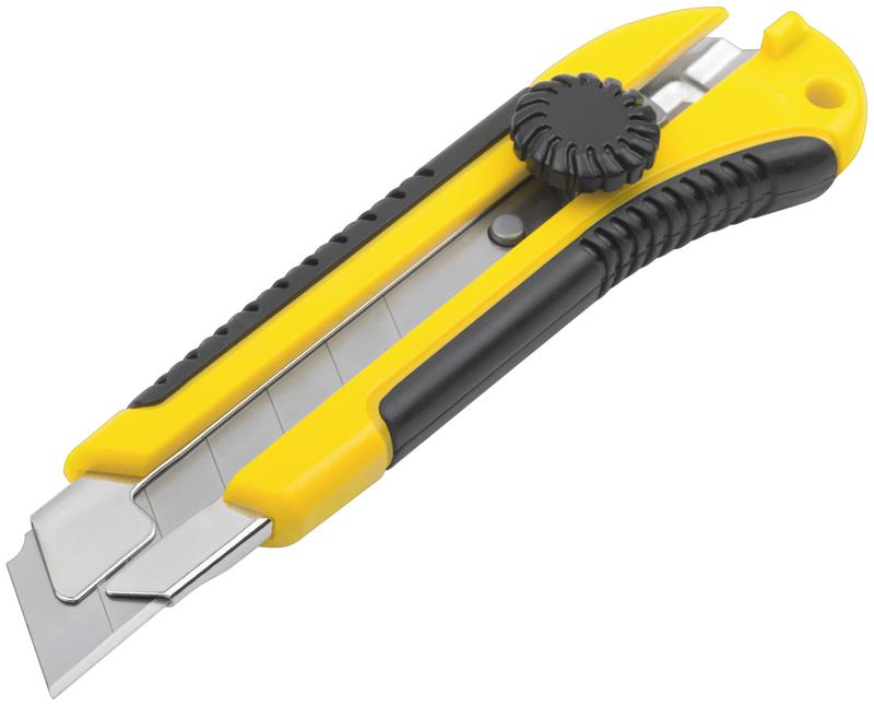 Применяется для резки бумаги, обоев,скотча, картона средней твердости.Сегментированное лезвие из инструментальной стали с вращающимся пластиковым прижимом. Пластиковый корпус с прорезиненными вставками обеспечивает крепкий захват и предотвращает выскальзывание при экплуатации.Металлические направляющие обеспечивают защиту лезвия от поломки и допускают увеличенные нагрузки