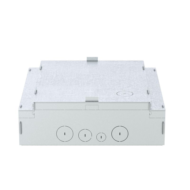 Монтажное основание для лючков с изменяемой глубиной на 24 модуля (код лючка 88324). Назначение: организация рабочих мест с помощью лючка в стяжке. Материал упрощенного монтажного основания – оцинкованная сталь. Минимальная высота стяжки – 90 мм. Максимальная высота стяжки – 110 мм. Габаритные размеры – 344х344х110 мм. Временная крышка (стальная идет в комплекте с опалубкой) удаляется сразу после заливки. Лючок устанавливается на место временной крышки. С 4-х сторон на боковых стенках находится перфорация для подвода электрических труб различных диаметров. Клемма для заземления расположена внутри опалубки, на дне. Комплект поставки: опалубка – 1 шт.; крышка металлическая – 1 шт.; уголки металлические – 2 шт.; наклейка – 1 шт.; инструкция – 1 шт. Поставляется в разобранном виде.