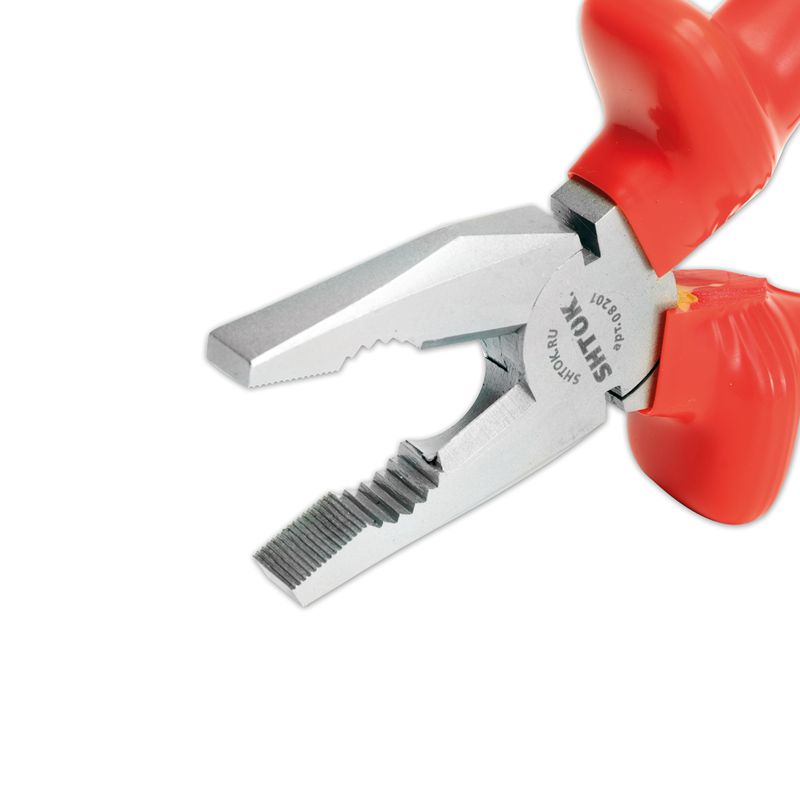 Рабочая часть диэлектрических пассатижей SHTOK 1000В 180 мм 08202, выполненная из хром-ванадиевой стали, увеличивает прочность инструмента.