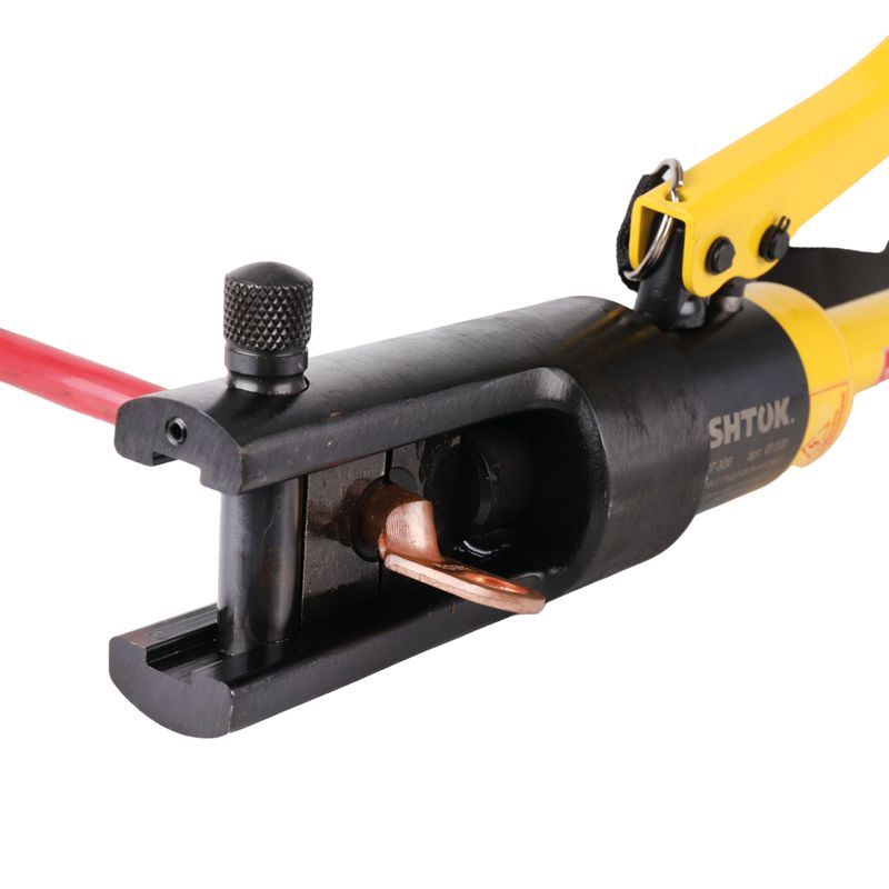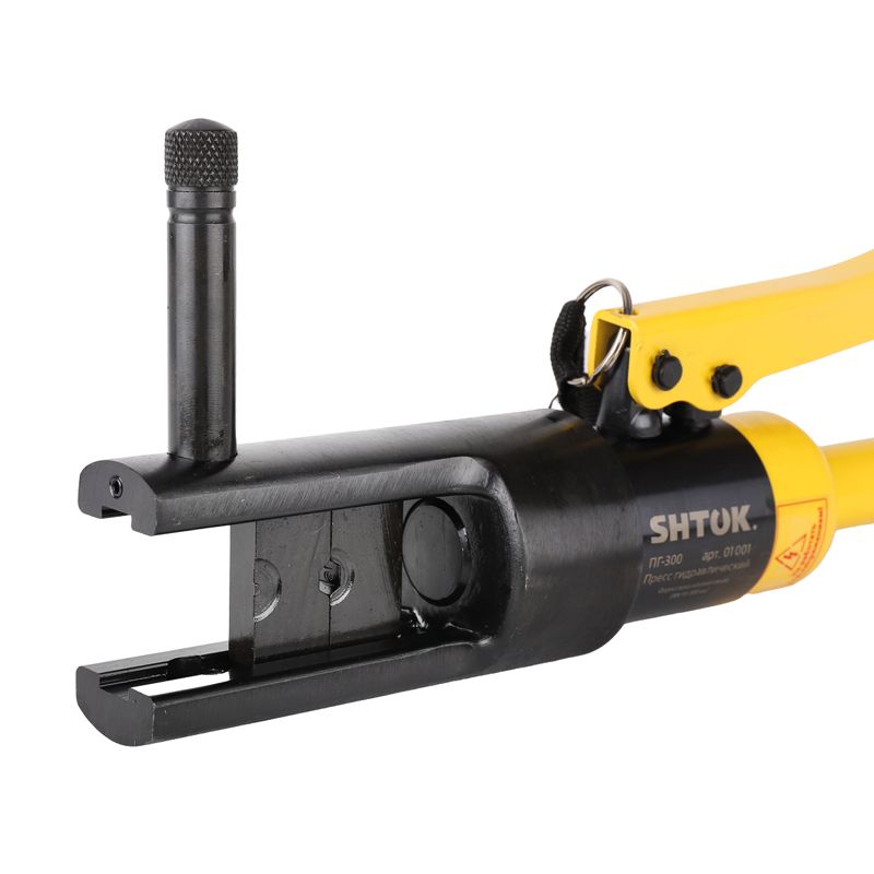 Особая конструкция ручного гидравлического пресса SHTOK ПГ-300 01001 плотно зажимает кабель, не давая ему ""выйти"" из рабочей области. Минимальная площадь опрессовки 10 мм.