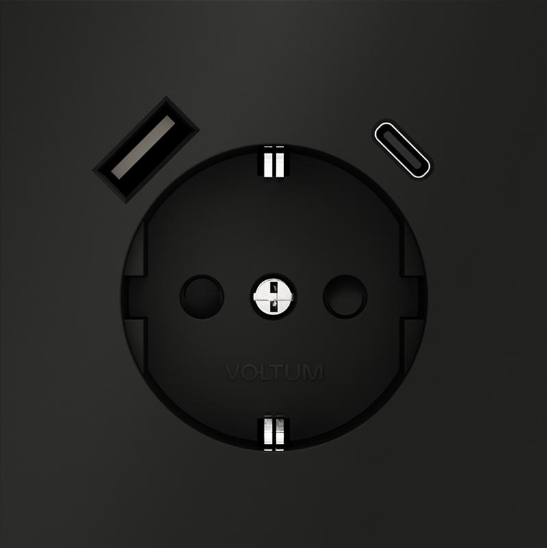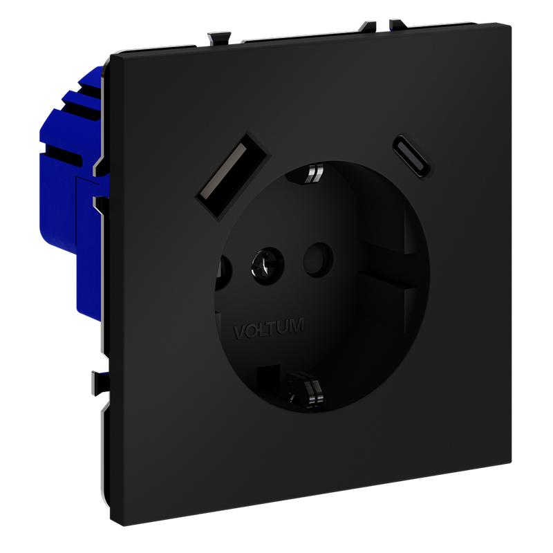 VLS040508 | Розетка 1-м СП S70 16А с USB A+С с заземл. защ. шторки механизм черн. матов. Voltum