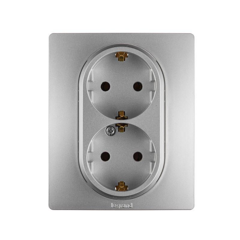 Розетка 2-м СП Etika 16А IP20 250В 2P+E с заземл. немецк. стандарт винт. клеммы в сборе алюм. Leg 672423