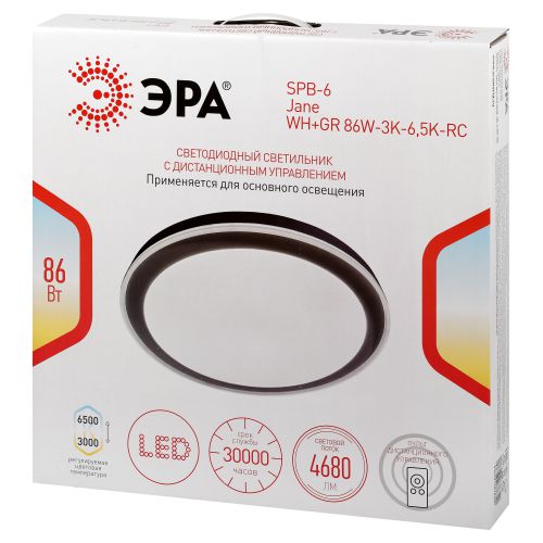 Светодиодный светильник ЭРА SPB-6 Jane 86W-3K-6,5K-RC WH+GR с пультом – современное решение для общего освещения жилых и коммерческих помещений.