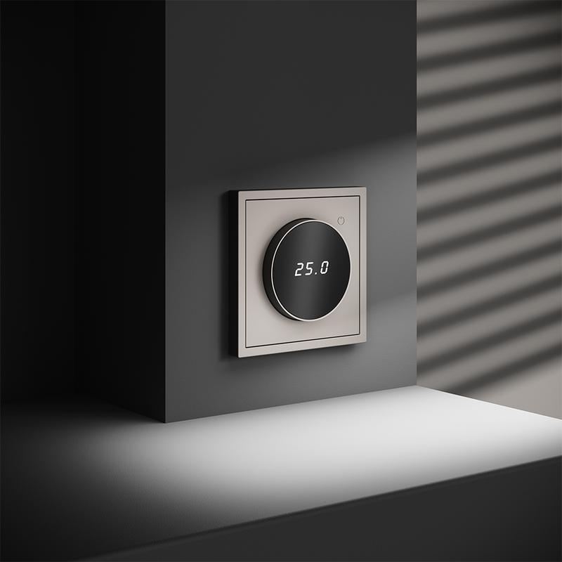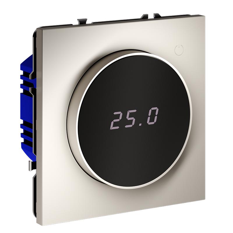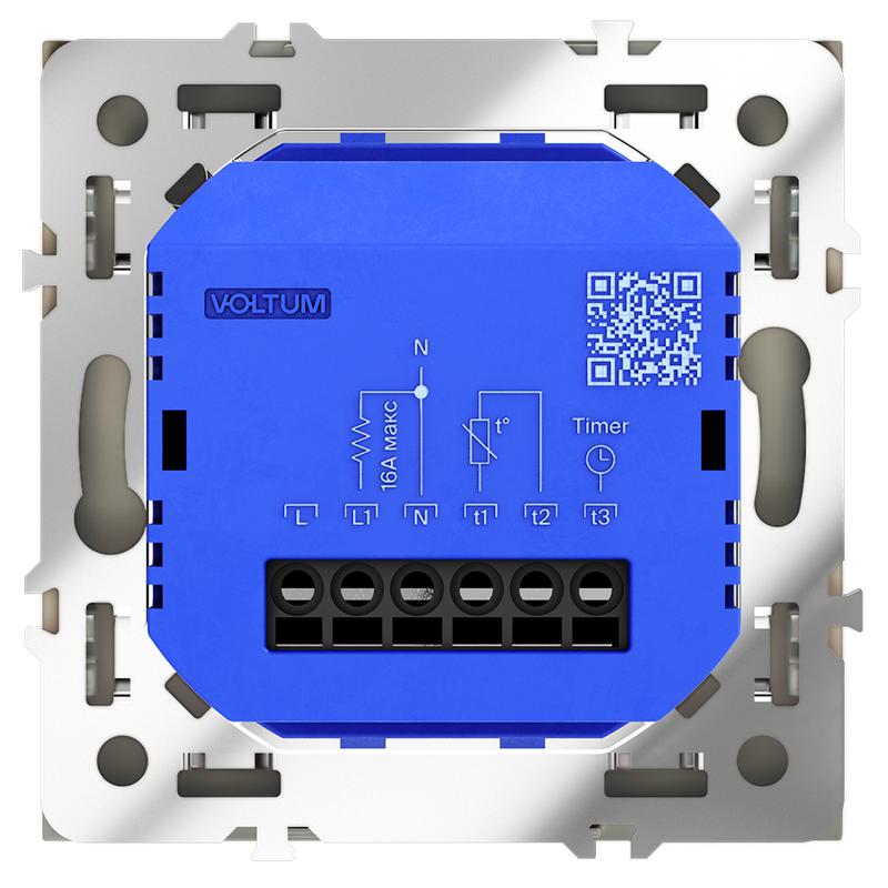 Место установки. Терморегуляторы Voltum предназначены для регулирования температуры теплого пола. Актуальны как в городских квартирах, так и в загородных дачных домах без центрального отопления. Корпус. Дизайн терморегуляторов Voltum сочетается со стилем остальных электрических устройств компании. Они совместимы со всеми рамками. Материал внешних декоративных элементов — поликарбонат. Конструктивные особенности. Терморегуляторы работают с любыми типами теплых полов и рассчитаны на нагрузку до 3500 Вт. Устройства оснащены светодиодной индикацией режима и дисплеем, на котором отображается температура поверхности пола. Красный индикатор — «подача питания на нагревательный кабель (идет процесс нагрева)», отсутствие индикации — «заданная температура достигнута». В течение 15 минут после нагрева терморегулятор переходит в интеллектуальный «спящий режим», уменьшая яркость подсветки цифр и сокращая энергопотребление. Регулировка осуществляется вращением панели управления. Терморегулятор поставляется в комплекте с механизмом из пластиковой накладки и датчиком температуры.