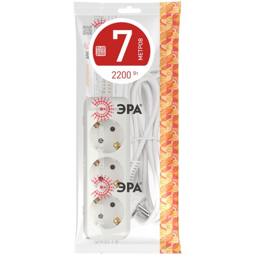 Удлинитель электрический Эра UX-3e-7m с заземлением, ПВС, 3x0,75мм2, 3 розетки, 7 м. Рассчитан на максимальную мощность 10А/2200 Вт. Удлинитель Эра станет Вашим надежным помощником, если Ваши любимые электроприборы находятся далеко от розеток. Провод в удлинителях Эра сделан из 100% меди, что делает его абсолютно пожаробезопасным. Корпус выполнен из ударопрочного и негорючего пластика (полипропилен). Вилка обеспечена кольцом для удобного извлечения ее из розетки. Модель удлинителя на 10А позволяет подключить бытовые приборы общей нагрузкой до 2200Вт. Дизайн удлинителя разработан в России командой Эра Style.