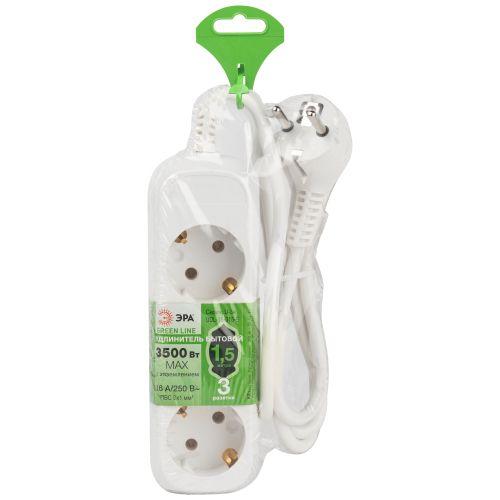 Удлинитель электрический Эра GREENLINE UDL-16-315-E с заземлением, на 3 розетки, провод 1,5м ПВС 3x1мм2. Рассчитан на максимальную мощность 16А/3500 Вт. Удлинитель станет Вашим надежным помощником, если любимые электроприборы находятся далеко от розеток. Корпус выполнен из ударопрочного и негорючего пластика (полипропилен). Вилка обеспечена кольцом для удобного извлечения ее из розетки. Модель удлинителя на 16А позволяет подключить бытовые приборы общей нагрузкой до 3500Вт.