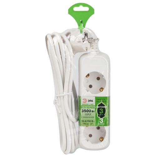 Удлинитель электрический Эра GREENLINE UDL-16-330-E с заземлением, на 3 розетки, провод 3м ПВС 3x1мм2. Рассчитан на максимальную мощность 16А/3500 Вт. Удлинитель станет Вашим надежным помощником, если любимые электроприборы находятся далеко от розеток. Корпус выполнен из ударопрочного и негорючего пластика (полипропилен). Вилка обеспечена кольцом для удобного извлечения ее из розетки. Модель удлинителя на 16А позволяет подключить бытовые приборы общей нагрузкой до 3500Вт.