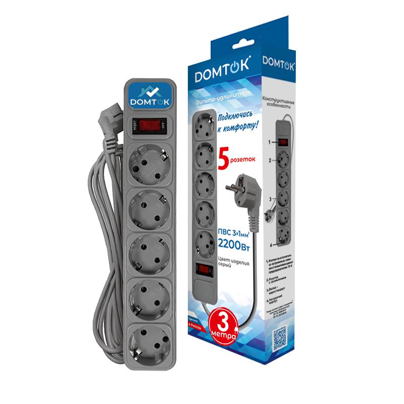 Удлинитель с сетевым фильтром 5х3м с заземл 10А IP20 2.2кВт ПВС 3х1 с выкл. сер. DOMTOK 2533