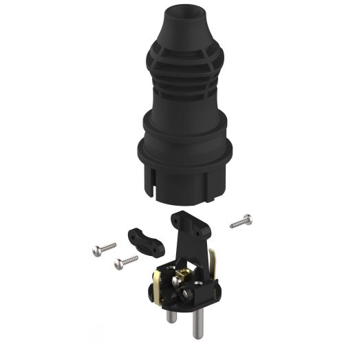 Прямая чёрная каучуковая вилка с заземлением из серии каучуковых разъёмов ЭРА российского производства. Имеется аналог в красном цвете. Рассчитана на нагрузку до 16 А и позволяет подключать кабель КГ сечением до 3x2.5 мм2.