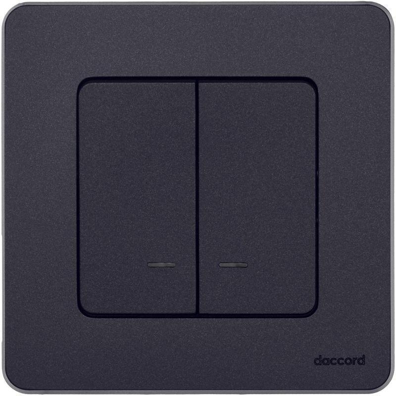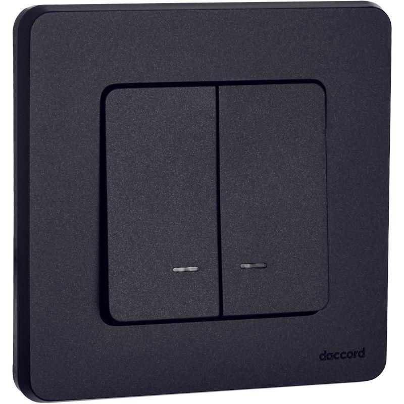 Выключатель двухклавишный с подсветкой/индикацией скрытого монтажа Inspiria, цвет "Антрацит", номинальный ток 10АХ, напряжение ~250В, безвинтовые зажимы. Устанавливается в жилых и общественных помещениях для управления приборами освещения, вентиляции и т.д. Предназначен для управления двумя электрическими цепями.